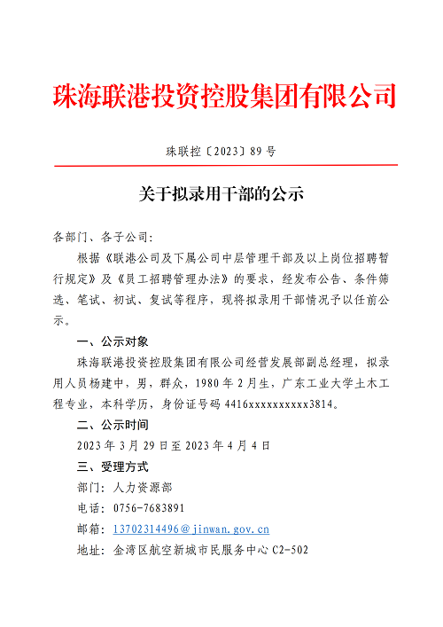 珠聯(lián)控〔2023〕89號 關于擬錄用干部的公示