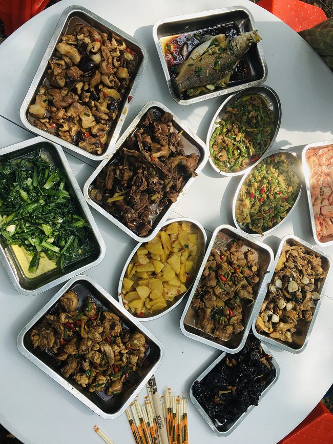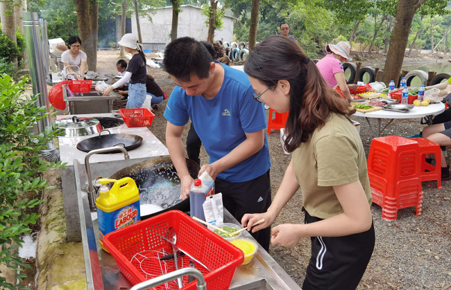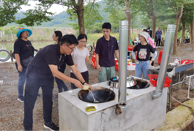活動結(jié)束后,大家來到燒烤、野餐場地,有的生火、有的配調(diào)料,洗菜、炒菜、燒烤,忙得不亦樂乎。沒過多久,一道道香噴噴的美食就擺在了眾人面前,整個野炊燒烤現(xiàn)場洋溢著歡聲笑語,其樂融融,大家庭的氛圍濃重、愜意。